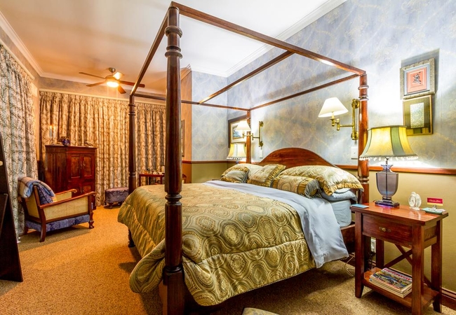 Breakfasts are served on the large patio overlooking the garden and dinners can be enjoyed in the elegant wood paneled dining room. The old world English style pub features an Elizabethan style fireplace for those chilly evenings.