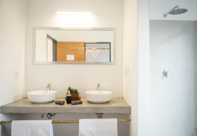 The bathroom is fitted with a large indoor walk-in shower with a view towards the mountains, a double basin and toilet. But in all but the coldest nights you can also enjoy your outside (rain-) shower. Built with a little wink at the old bucket showers …but don't worry; ours has hot water.