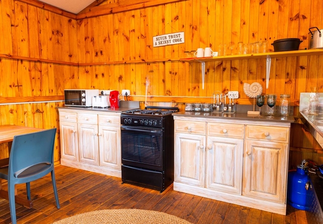 The Kingfisher Tent sleeps four guests. It is furnished with a queen size bed and two single beds. The en-suite bathroom leads onto a semi outdoor double shower. The kitchenette is equipped eith a two-plate gas hob, fridge, microwave, toaster, kettle and single sink. Patio furniture, weber. NO TV