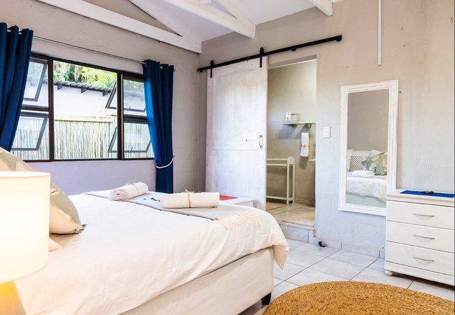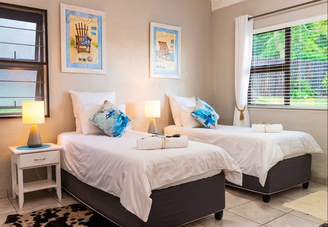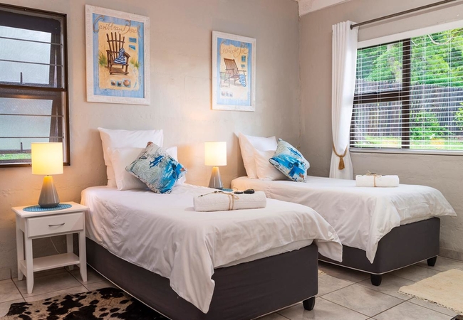 This cottage has two en-suite bedrooms, a kitchen, lounge and a patio leading to the pool area. The main bedroom is furnished with a Queen-size bed and the second bedroom has two single beds. Linen and towels are provided.