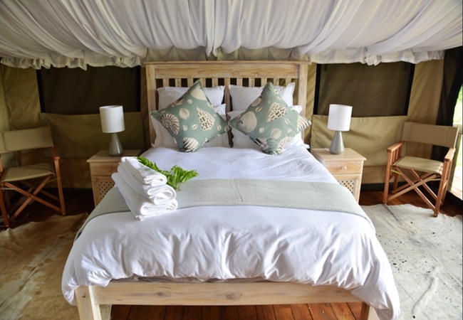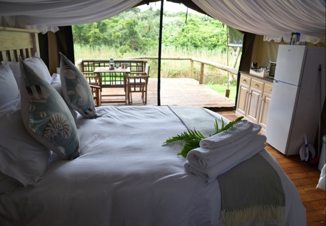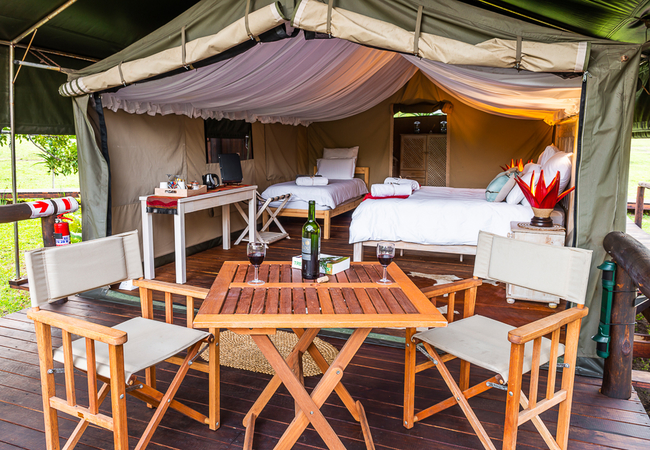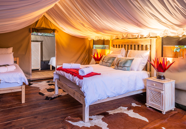 The tent sleeps 4 people with one queen size bed and two single beds. The en-suite bathroom leading onto a semi outdoor double shower. The kitchenette is equipped eith a two-plate gas hob, fridge, microwave, toaster, kettle and single sink. Patio furniture, weber. NO TV