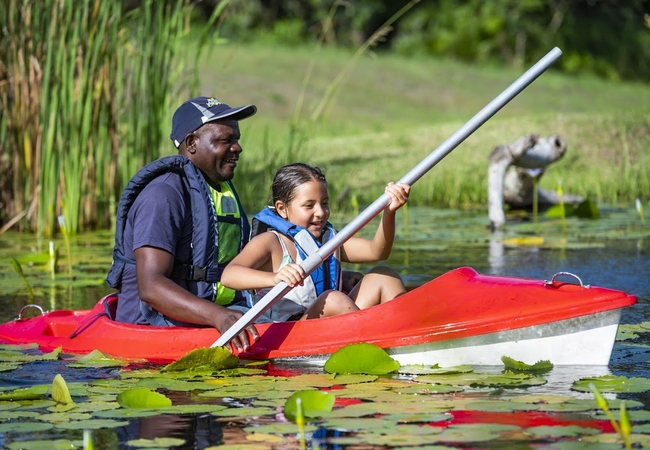 Well appointed double room with queen size bed and two single beds in a separate room. Good quality linen with room fan and patio overlooking a small lake with a fully equipped kitchenette. Semi outdoor shower and bath with toilet and double vanity.