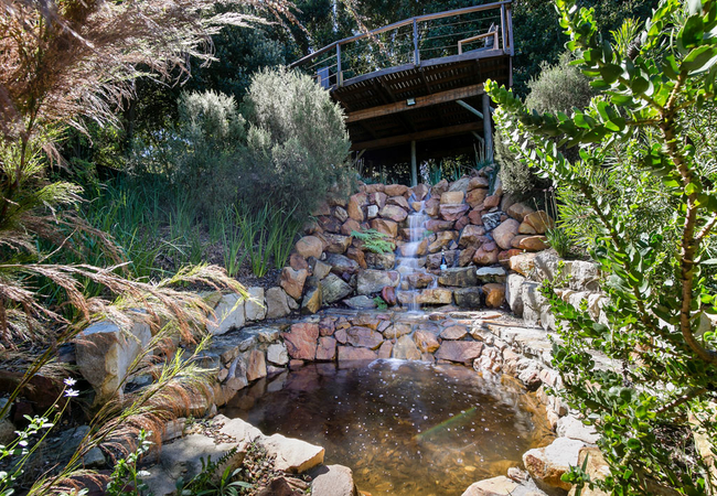 A large sunset deck caters for any occasion from an abundant breakfast to a wine from our neighboring farm Cape Point Vineyards. No less than 6 outdoor areas feature over the large gardens and cater for any occasion and all weather conditions and vantage points. A waterfall feeds a water stream running through the heart of the gardens.