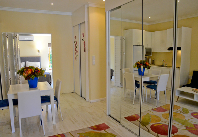 Rooms come with either twin or king-size extra length beds (of orthopaedic quality); and a "kitchen-cupboard" equipped with bar fridge, microwave, kettle and prep bowl. Each room has a big screen satellite TV with a variety of channels for sport and entertainment.