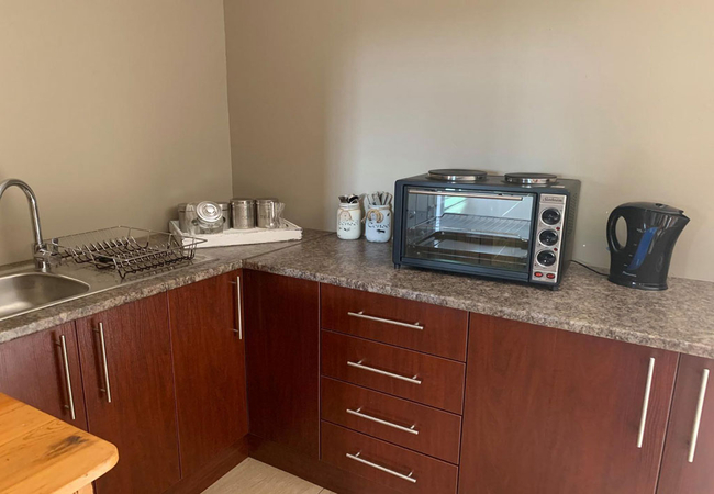The open-plan living area offers a kitchen that is equipped with a 2-plate stove and oven, a fridge, tea and coffee facilities and a dining area. The lounge has a TV with DStv and sliding doors leading onto a braai and patio area. Wi-Fi is available.