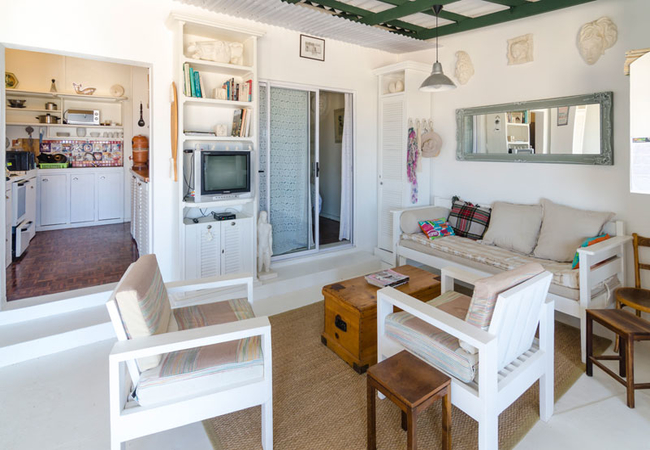 There is an open plan lounge and dining area, complete with a built-in braai and a fully equipped kitchen. The lounge is furnished with a comfortable couch, chairs, full DStv and boasts stunning 180° sea views.