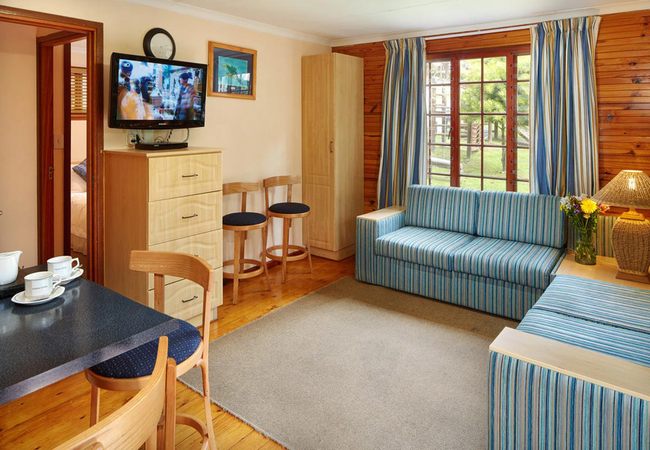 Knysna Chalets has twenty eight self catering units. Each of the chalets sleep two adults and two children. There is a bedroom with a Queen-size bed and a sleeper couch. The bathroom has a shower, bath and toilet. A hairdryer is included.