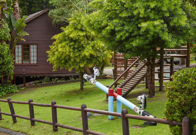 Knysna Chalets has twenty eight units. Each of the chalets accommodates two adults and two children. There is a bedroom with a Queen-size bed and a sleeper couch. The bathroom has a shower, bath, basin and toilet. A hairdryer is included. The kitchen is equipped with a fridge, microwave, a stove top, crockery and cutlery. The breakfast bar with bar stools. The living area is comfortably furnished and has TV with DStv / Satellite channels. Outside is a patio with outdoor table / chairs and a braai. Braai utensils are supplied. The resort has a games room, children's playground and swimming pool.