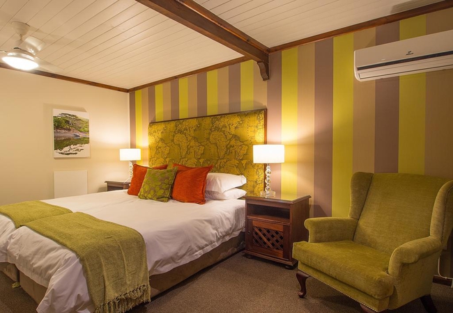 Master bedroom with a sleeper couch for a third person, with an en-suite bathroom. Please note that the sleeper couch is in the same room as the double bed and not separate. All our rooms are equipped with Air-conditioning and ceiling fans, Electronic safes, Remote control TV's, Free Wi-Fi, Direct dial telephones, Hairdryers and Tea/coffee making facilities.