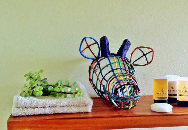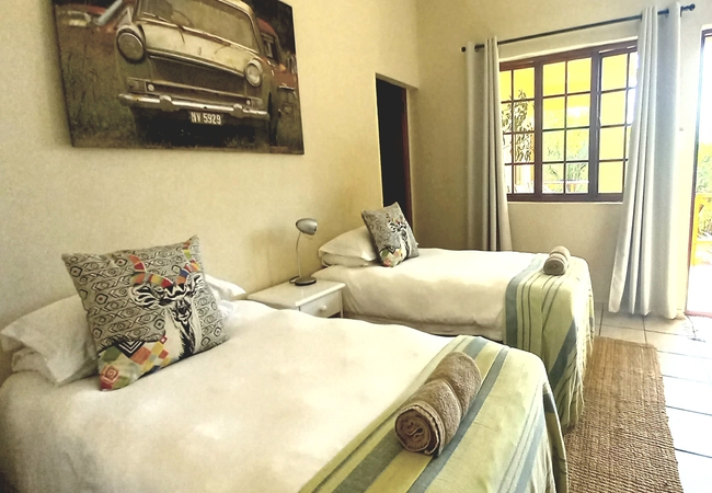 This room is calm and peaceful, decorated in Mozambican greens with touches of our grandmother's antique furniture, and printed canvas images from our photographer friends which accentuate the colour elements. It has twin beds with an en-suite bathroom consisting of a shower, loo and washbasin. The room also has a coffee station with plunger coffee and tea making facilities. It has its own entrance and is connected to the Main house via an extended veranda from the terraced front stoep. Please note: Wifi access is available. Ten (10) steps lead to the veranda which makes the room unsuitable for persons with walking difficulties. No self-catering option. No extra beds. No children under 12.