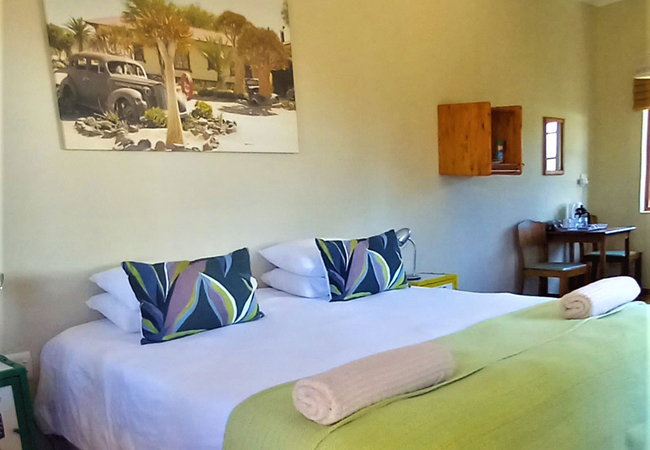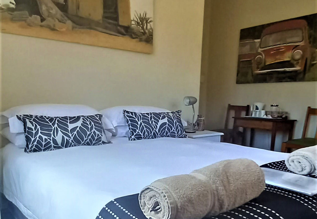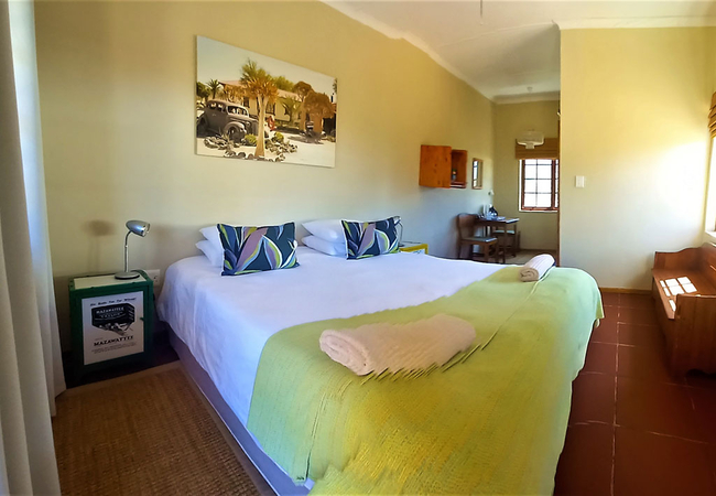 The corner room has its own private entrance and courtyard with 180 degree views of the mountains behind as well as Towerkop. It has a double bed and an en-suite bathroom consisting of a bath (no shower), loo and washbasin. It is decorated in a clean open style that reflects the surrounding landscape beautifully. It has its own plunger coffee and tea station that allows you to make a warm cuppa and enjoy the views from the comfort of your own terrace. This room is connected to the main annex. Please note: Limited Wifi access only. Three steep steps lead to the path which leads to the room which makes it unsuitable for persons with walking difficulties. No self-catering option. No extra beds. No children under 12.