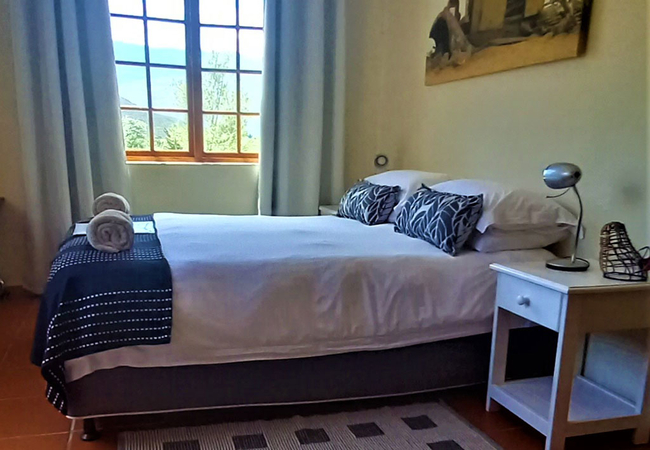 This bright and beautiful room is a personal favourite with windows on three sides offering views of all of the surrounds. It's decorated in bright Mozambican greens and offers twin or a king size bed as well as an en-suite bathroom with shower, loo and washbasin. It has its own plunger coffee and tea station with 180 degree views of the mountains and Towerkop beyond. It has its own entrance and is connected to the Main house via the extended veranda that looks out over the front of the property with vineyards and orchards beyond. Please note: Wifi access is available. Ten (10) steps lead to the veranda which makes the room unsuitable for persons with walking difficulties. No self-catering option. No extra beds. No children under 12.