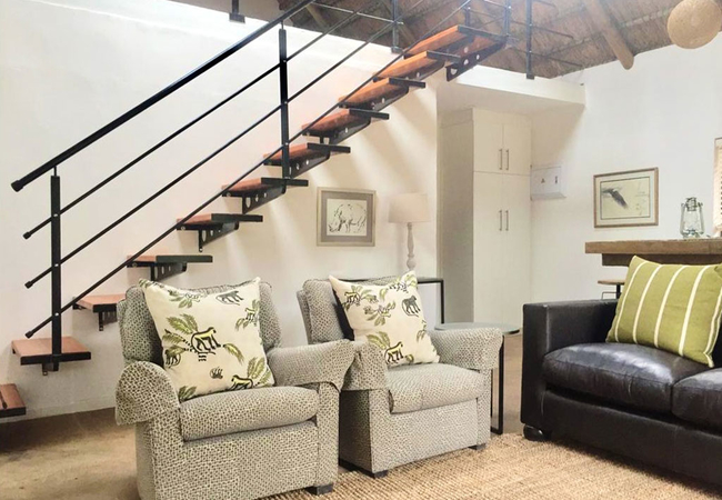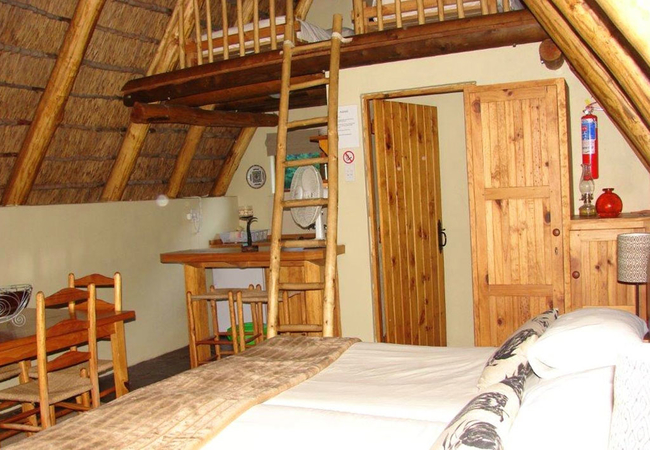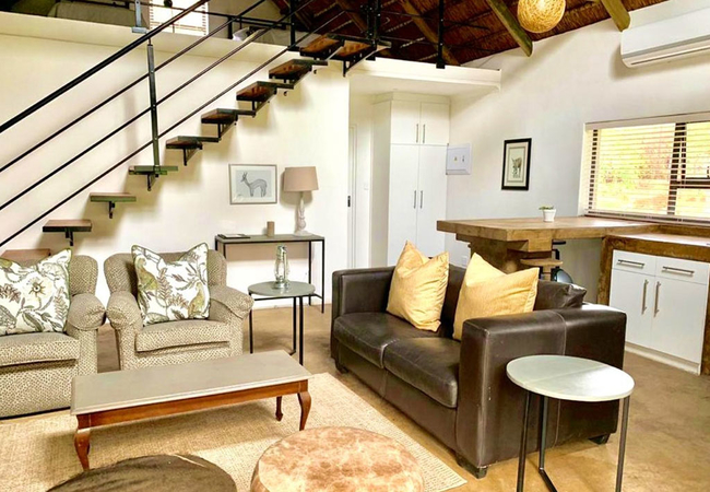 Stylishly decorated, 1 bedroom chalet with staircase to loft area, sleeps 4 guests, with an en suite bathroom, fully equipped kitchen with oven and hob and own private braai (barbecue) facility. Each chalet has it's own private parking area