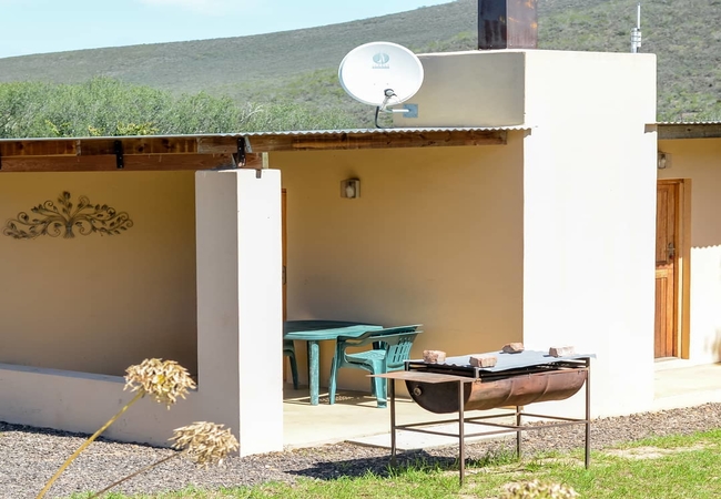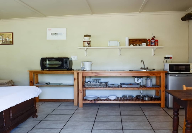 Koljander Self Catering Unit is a self catering unit situated in close proximity to one other self catering unit on the Wilde Paarde Kloof Farm. The unit sleeps four guests in two single beds and a sleeper couch. The bathroom has a shower and linen is provided. This cosy open plan area has a seating area and a TV with DStv as well as a fireplace. There are tea / coffee making facilities, a counter top oven with a two plate stove, a microwave, kettle, crockery and cutlery. The outside area has a patio area with a table, chairs and a braai.