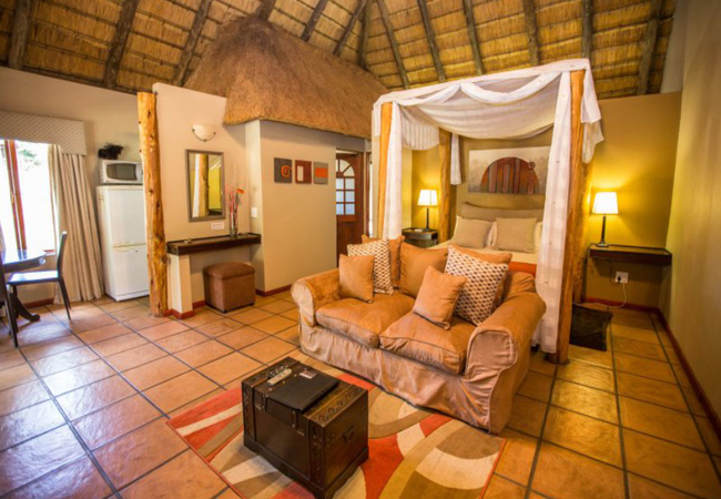 The Leopard Suites are self catering units for 2 persons, each with a romantic canopied double bed with electric blanket and large bathroom with feature spa baths. Each additionally has a lounge area with an open fire place, a small fully equipped kitchen with dining area and a private verandah with a built-in braai area.