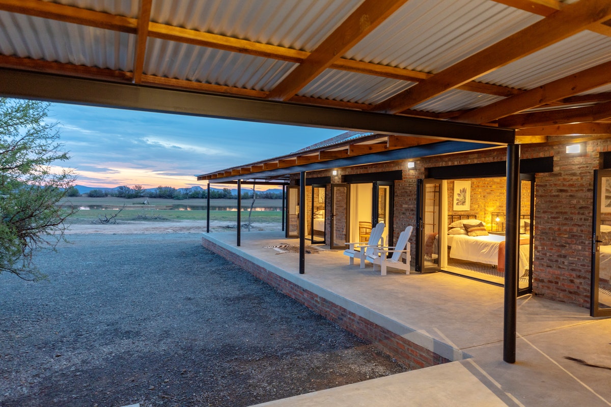 The house can accommodate up to eight guests and comprises four bedrooms, four en-suite bathrooms and an open-plan kitchen and living area. Each bedroom is furnished with two single beds. Each en-suite bathroom has a shower, toilet and basin. Free Wi-Fi access is also provided. The kitchen is fully equipped for self-catering and contains a stove, oven, fridge-freezer, microwave, and cutlery and crockery. There is also a breakfast bar with stools. The lounge has a comfy lounge suite and a wall-mounted flat-screen TV with selected DStv channels. The living area opens up onto a wraparound verandah which has outdoor patio furniture, an outdoor dining set, and braai facilities. The patio overlooks a farm dam.