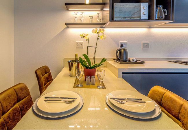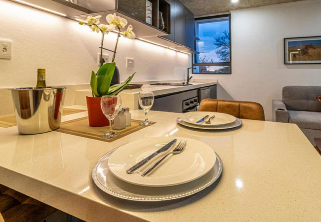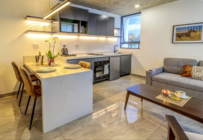 Kravit Premier Suites provide ample space in the open-plan lounge and kitchen. The bedroom has an extra-length Queen-size bed and a luxurious shower. Our décor reflects a modern equestrian lifestyle that will make you feel right at home. Amenities include free uncapped Wi-Fi, air-conditioner, block-out curtains, a safe box, wardrobes, a Smart TV with DStv, a fridge, stove, oven, microwave and a tea and coffee station.