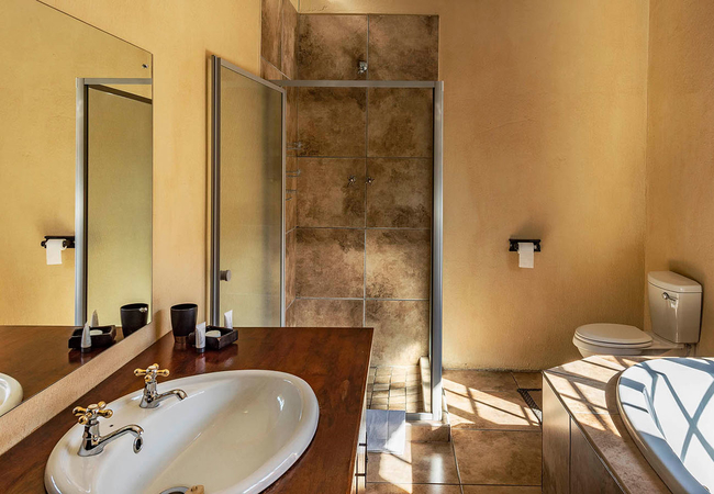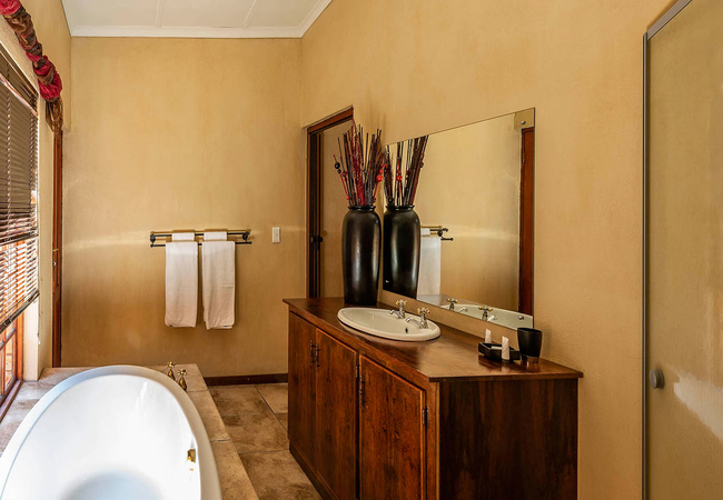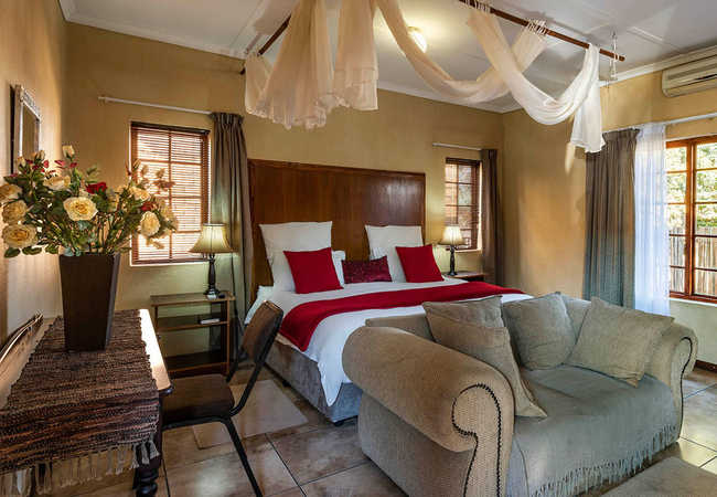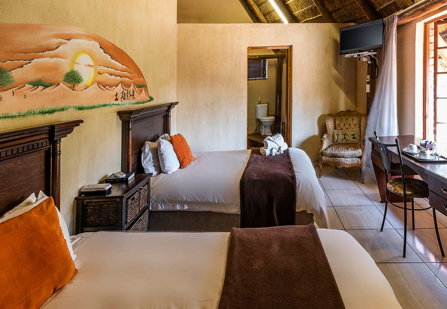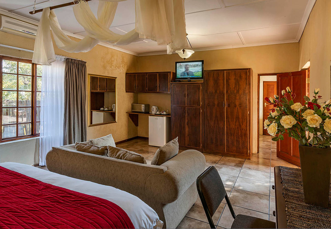 The Family Room is a five-sleeper unit. It is furnished with one double bed, one double bunk and a single sleeper couch. The en-suite bathroom is equipped with a shower, hand basin and WC. Other facilities in the rooms include air-conditioner, flat screen TV with a variety of DSTV channels. There is a small working table and chair and tea and coffee making facilities.