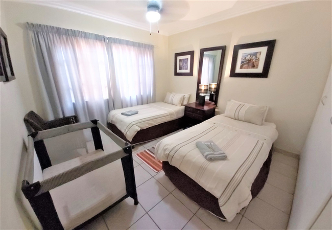 Kuta Beach 7 offers comfortable self-catering accommodation in a well-appointed 3-bedroom apartment, ideally located on the ground floor of the Kuta Beach complex in Ramsgate. Perched high on a hill, the complex boasts lovely sea views and is conveniently situated near both Ramsgate and Margate’s main swimming beaches. The apartment can comfortably accommodate up to six guests. It features two bedrooms with double beds and a third bedroom with two single beds, making it ideal for families or groups of friends. There are two bathrooms—one with a shower and the other with a bath. The open-plan kitchen is fully equipped with modern conveniences including a fridge, oven and stove, microwave, dishwasher, and a washing machine/tumble dryer combo. A breakfast counter with stools separates the kitchen from the spacious lounge, which offers a Smart TV with access to streaming platforms like Netflix (guests must use their own login credentials). Complimentary Wi-Fi is available throughout the apartment. The unit has a one garage which is one flight of stairs above the unit. The complex has a communal swimming pool.