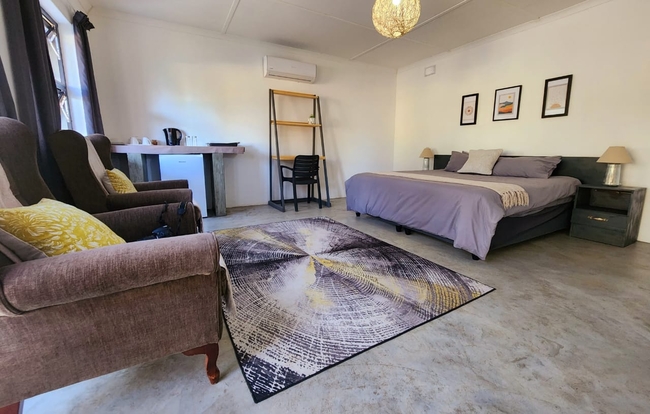 This chaletis spacious, open plan and furnished with a King-size bed and two single beds. The bathroom is fitted with a shower, toilet and basin. The room boasts beautiful river views, air-conditioning, a bar fridge, coffee/tea maker, braai facilities and it has its own little garden.