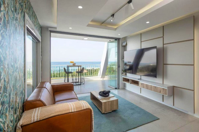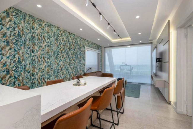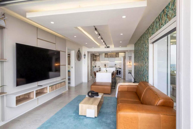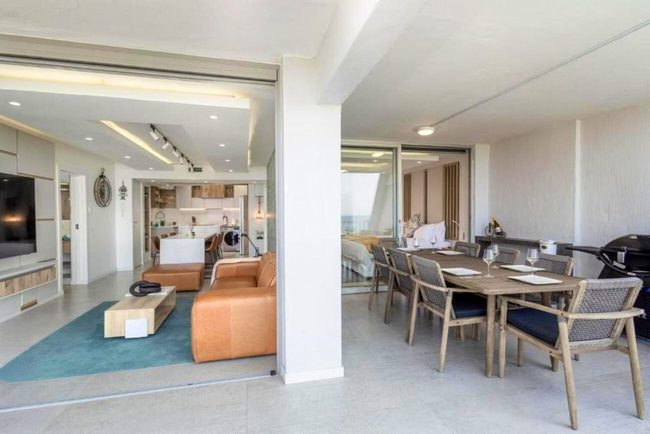 The living space is open-plan, featuring a fully equipped kitchen with a stove, oven, microwave, fridge-freezer, and a complete set of cutlery and crockery. For added convenience, a dishwasher and washing machine are included. Adjacent to the kitchen is a six-seater dining table, ideal for family meals. The lounge area offers comfortable seating, a smart TV with access to YouTube and Netflix, and complimentary Wi-Fi.