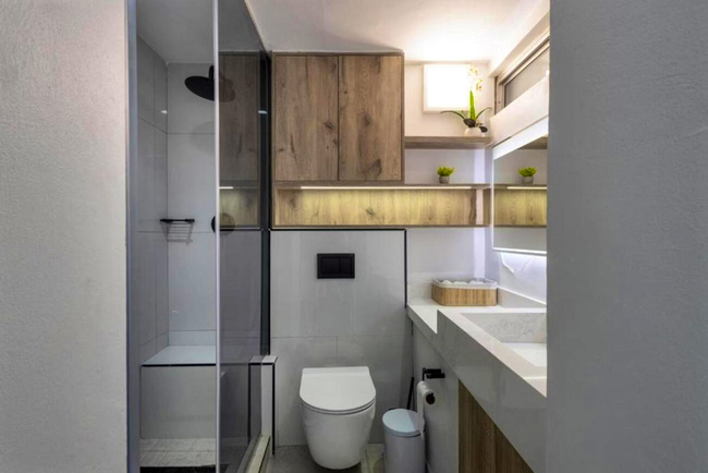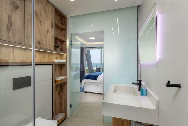 This apartment accommodates up to six guests across three bedrooms and two bathrooms. Two of the bedrooms are furnished with double beds, one of which includes an en-suite bathroom with a shower, washbasin, and toilet. The third bedroom contains two single beds, while the second bathroom is also equipped with a shower, washbasin, and toilet.