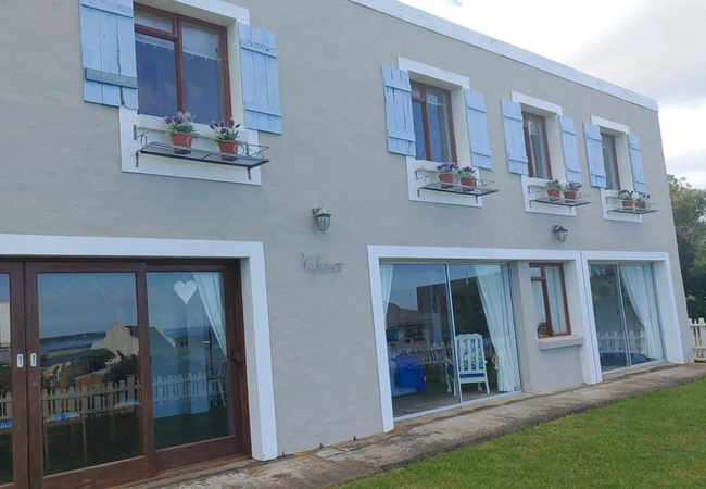 Kykmar is a self catering holiday home with five bedrooms. There are three bedrooms with double beds and two bedrooms with two single beds. The house has three bathrooms, one of which is the main bedroom's en-suite bathroom and has a bath, shower, toilet and basin. The second, separate bathroom has a bath, shower, toilet and a basin. There are also two guest toilets and a hot water shower outside. The kitchen is equipped with a stove, oven, fridge / freezer, microwave, tea / coffee making facilities, crockery and cutlery. The lounge area offers comfortable sofas and a TV with satellite channels, as well as a dining area with ample seating. The lounge doors fold open onto the lawn and the beautiful views. The house has an indoor braai and secure parking.