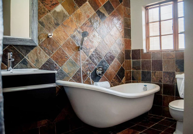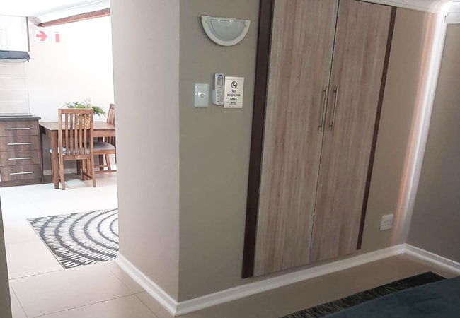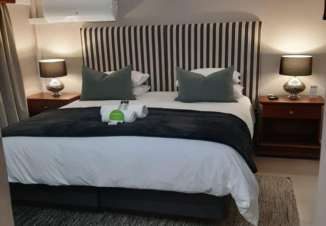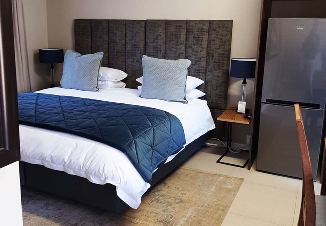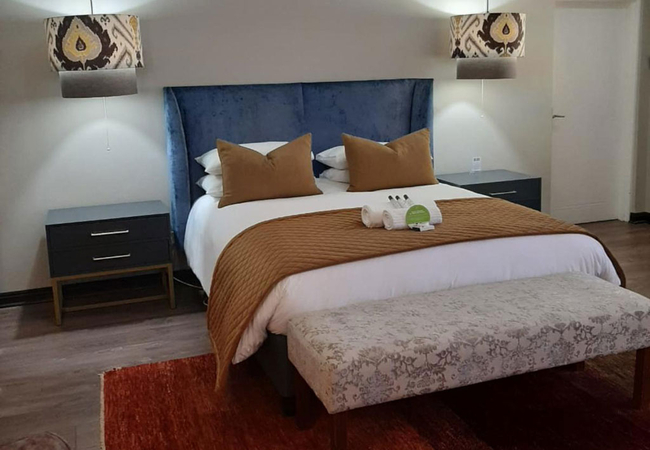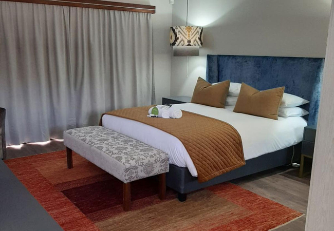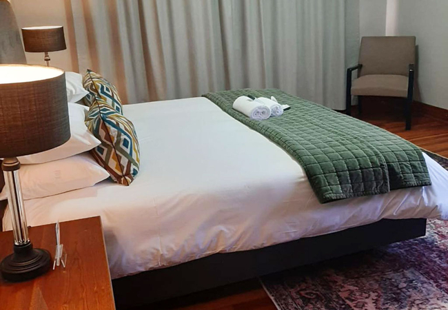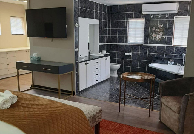 Executive King Room 1 is furnished with a King-size bed. The en-suite bathroom is fitted with a bath, toilet and basin. The room offers air-conditioning, a TV with DStv and Wi-Fi access. Guests have access to a communal kitchen and guest lounge.