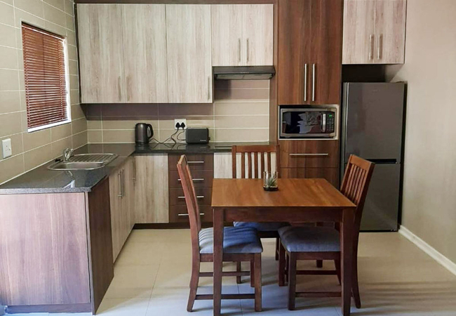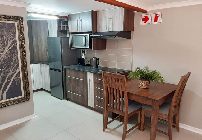 Suite 1 is furnished with a Queen-size bed. The en-suite bathroom is fitted with a shower, toilet and basin. The suite offers a private kitchen with induction stove, air-conditioning, a TV with DStv and Wi-Fi access. Guests have access to a communal kitchen and guest lounge.