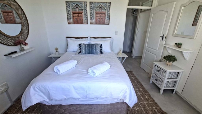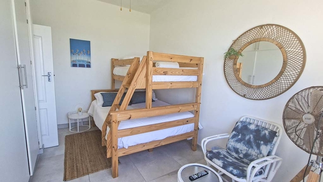 The apartment accommodates up to four adults and three children across three bedrooms and features two bathrooms as well as a guest toilet. The first and second bedrooms each contain a comfortable double bed, while the third bedroom is equipped with a child-only tri-bunk bed. Both bathrooms are fitted with showers. Fresh linen is supplied, though guests are requested to bring their own towels. The fully equipped kitchen includes a stove, oven, microwave, kettle, toaster, fridge-freezer, washing machine, and tumble dryer, providing all the essentials for self-catering. The lounge and dining areas offer ample, comfortable seating, complemented by a Smart TV and free Wi-Fi for entertainment. The living area extends onto a balcony furnished with outdoor seating and a gas braai, perfect for enjoying meals or relaxing while taking in the sea view. Residents also have access to the communal swimming pool, additional braai facilities, and meticulously maintained gardens. Secure parking is available for one vehicle.