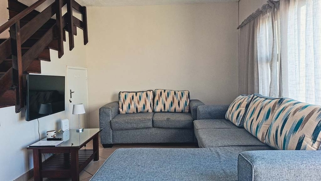 The duplex comfortably accommodates four adults and two children across three bedrooms, two bathrooms and an additional guest toilet. Two of the bedrooms are each furnished with a double bed, while the third bedroom is equipped with two child only beds. The first bathroom features a shower, washbasin and toilet, while the second bathroom is fitted with a bath and washbasin. Bed linen is supplied for guests’ convenience, however bath and swimming towels are not provided and should be brought along. The kitchen is fully equipped for a relaxed and practical self catering stay, and includes a fridge freezer, stove, oven, microwave, as well as cutlery, crockery and tea and coffee making facilities. A dishwasher and washing machine are also available, ensuring added ease during longer visits. The open plan dining and lounge area offers comfortable seating for shared meals and leisure time, and a smart television provides entertainment. Wi Fi access is available throughout the unit. Guests have access to a private balcony with pleasant ocean views, creating an ideal setting for morning coffee or an evening unwind. The complex further offers a communal swimming pool, well maintained gardens, braai facilities and a secure area where children can play safely. Secure parking is provided on site.