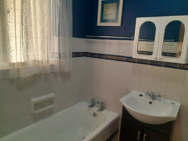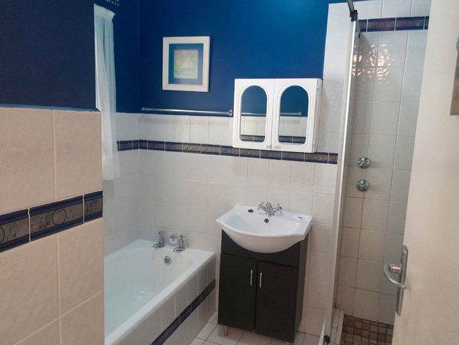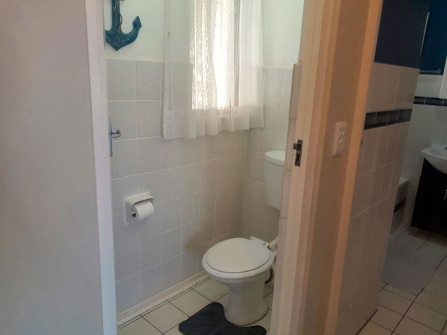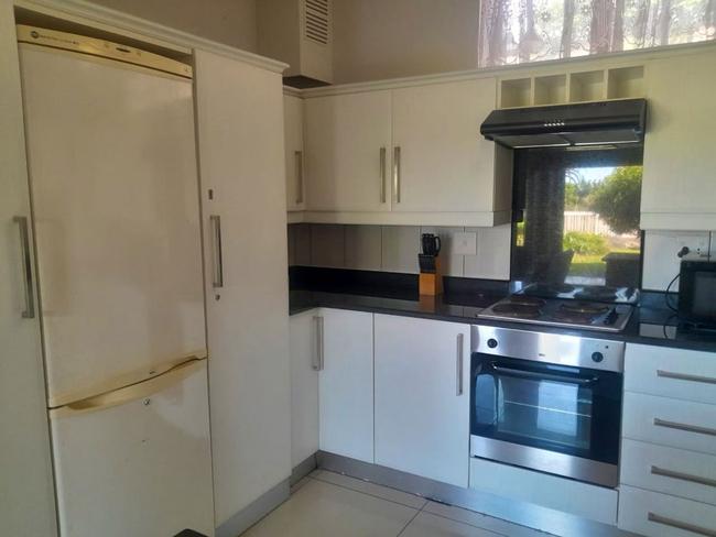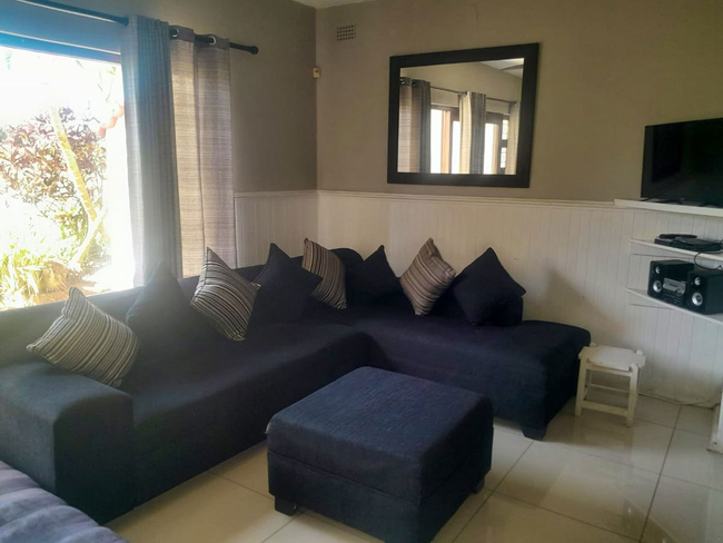 The open-plan lounge and dining area create a welcoming space for relaxation, seamlessly extending onto a private patio. The kitchen is fully equipped with all essential appliances and cookware, including a dishwasher and washing machine for added convenience. The lounge is comfortably furnished and includes a television with a DStv connection, guests are reminded to bring their own decoder, smart card, and remote.