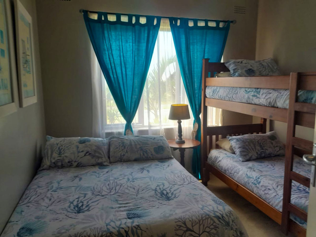 Designed for comfort, the apartment accommodates up to six guests in two well-appointed bedrooms. The main bedroom features a double bed, while the second bedroom is furnished with a double bed and a sturdy bunk bed. A shared full bathroom serves the unit. The open-plan lounge and dining area create a welcoming space for relaxation, seamlessly extending onto a private patio. The kitchen is fully equipped with all essential appliances and cookware, including a dishwasher and washing machine for added convenience. The lounge is comfortably furnished and includes a television with a DStv connection, guests are reminded to bring their own decoder, smart card, and remote. A built-in braai on the patio offers the perfect setting for alfresco dining, while the communal braai areas alongside the swimming pool provide additional options for outdoor cooking. Just a short walk through the garden and across the road brings guests directly to the shoreline, where they can enjoy the rocky outcrops and sandy stretches of the coast. The scenic Lilliecrona Boulevard, spanning 1.5 km, leads to Lucien Beach, an inviting spot for swimming. From there, a further 500 m stroll along the sand reaches Margate’s main beach.