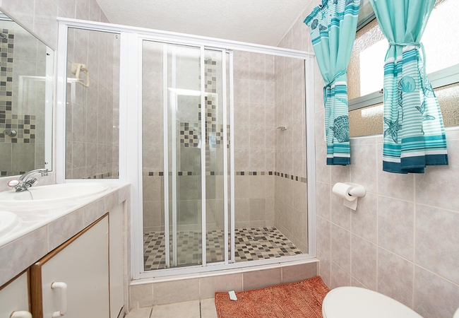 The main bedroom is furnished with a Queen-size bed and has an en-suite bathroom fitted with a shower, toilet and basin. The second bedroom is furnished with a Queen-size bed and the third bedroom has two single beds. These two rooms make use of a bathroom fitted with a bath and shower over the bath, toilet and basin.