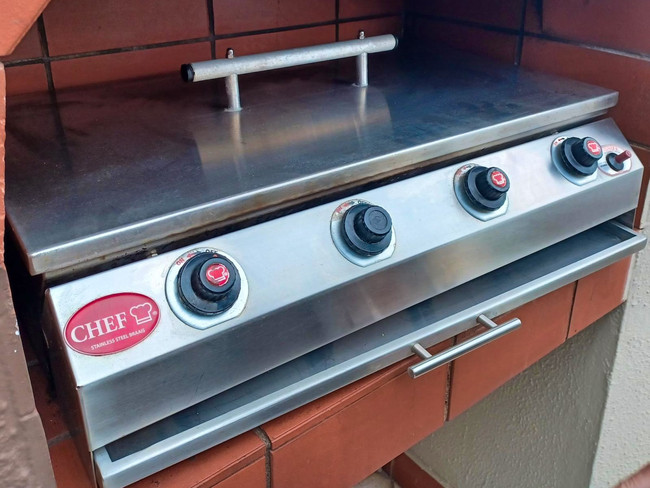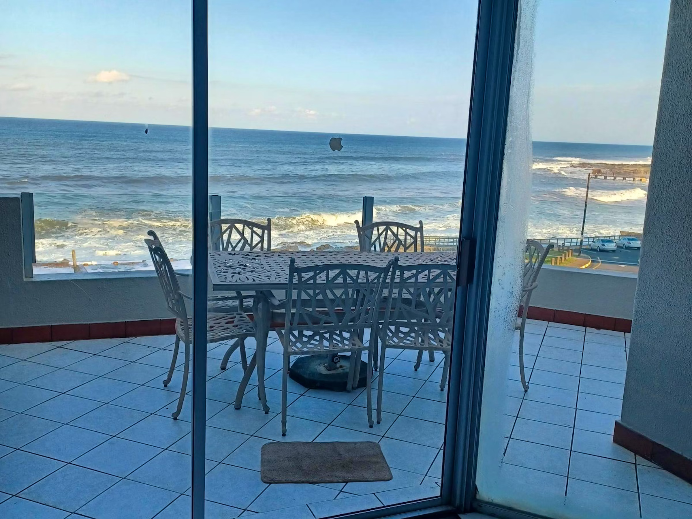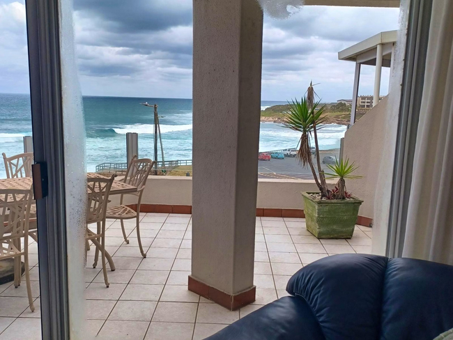The open-plan living area is furnished with a dining table, comfortable seating, and a TV with DStv. Wi-Fi access is also available. The apartment includes a balcony with a braai (barbecue) area, a dining table, and breathtaking views of the ocean.