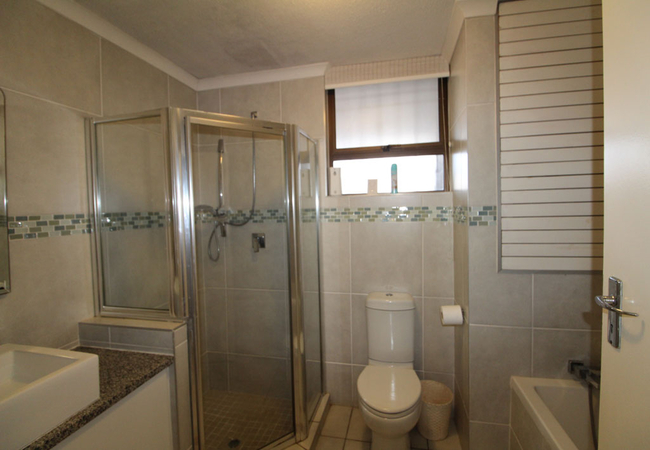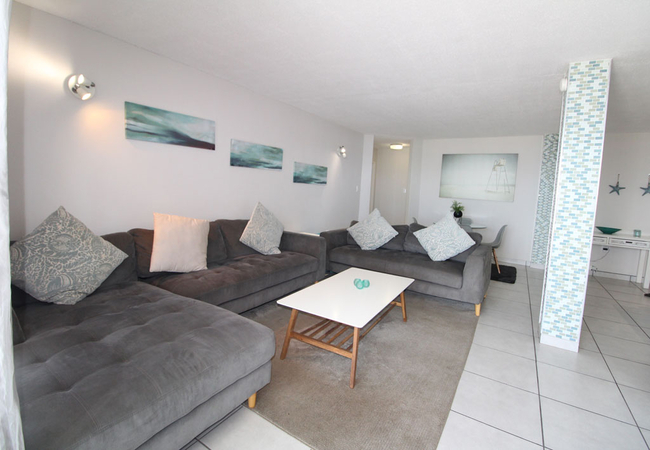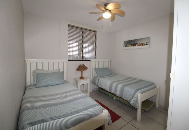 La Domaine 1 can accommodate up to six adults and comprises three bedrooms, two bathrooms, and an open-plan kitchen, dining and living area. The first bedroom is furnished with a double bed and has a shower en-suite with a toilet and washbasin. The second and third bedroom each have two single beds. These bedrooms share a bathroom with a bath, a toilet, and a washbasin. The kitchen is well-equipped for self-catering with a stove and oven, fridge, kettle, toaster, microwave, washing machine, tumble dryer and dishwasher. The dining area has a 4-seater dining table and chairs. The lounge offers comfortable couches, and a smart TV with DStv and Wi-Fi. The lounge opens to a large sea-facing balcony with outside dining area. Secure parking is available within the complex.
