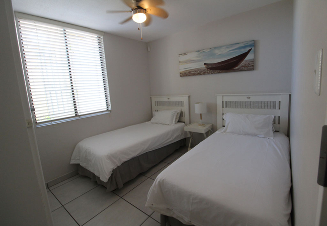 The first bedroom is furnished with a double bed and has a shower en-suite with a toilet and washbasin. The second and third bedroom each have two single beds. These bedrooms share a bathroom with a bath, a toilet, and a washbasin.