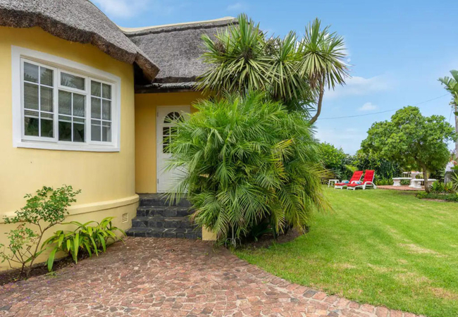 Lagoon Cottage – Chalet has one bedroom furnished with a Queen-size bed. The en-suite bathroom is fitted with a shower, toilet and basin. The kitchenette is equipped with a microwave, small fridge and tea / coffee making facilities. There are comfortable armchairs and a TV with DStv. Wi-Fi is also provided. Outside is a small deck overlooking the garden and outdoor seating. Braai facilities are available. Off street parking is provided.