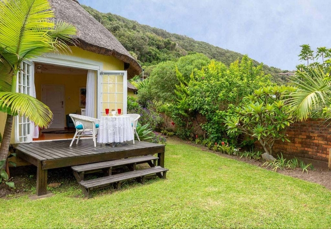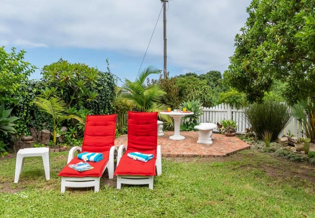 Outside is a small deck overlooking the garden and outdoor seating. Braai facilities are available.