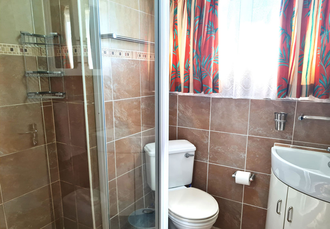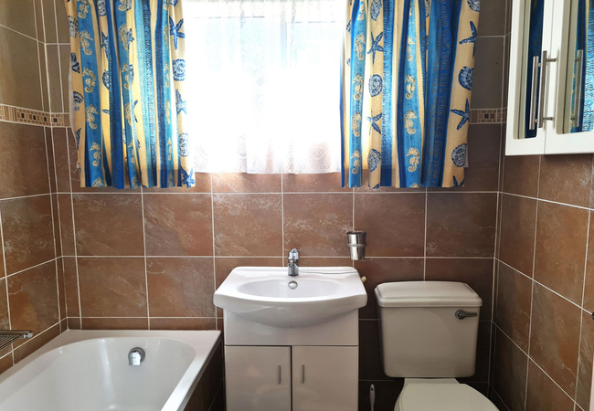 The first bedroom is furnished with a double bed, and the second bedroom is furnished with two single beds. There are ceiling fans in the bedrooms. The first bathroom is equipped with a bath, hand basin and WC and the second bathroom is equipped with a shower, basin and WC.