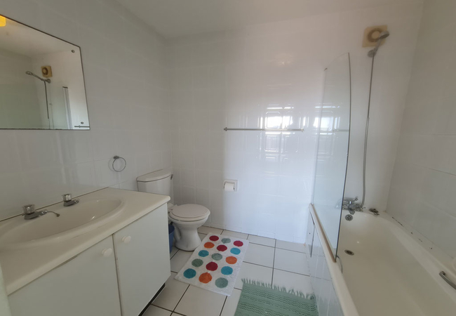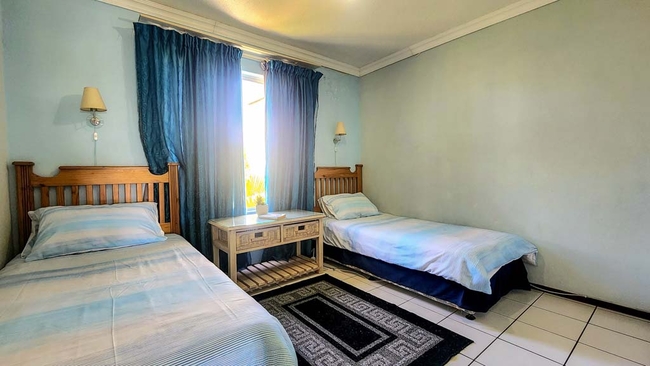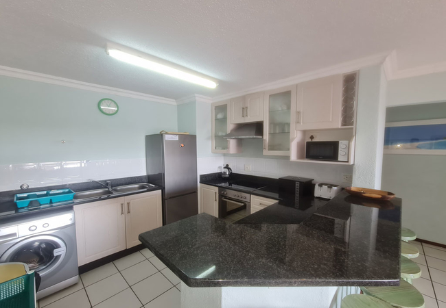 Situated on the top floor, Laguna Le Crete 71 is a spacious unit which is comfortably furnished and equipped with everything you will require for a self catering stay. Boasting sea views, the main bedroom is furnished with a double bed, a ceiling fan and a door leading to the veranda. The en-suite bathroom consists of bath, toilet and basin. The second and third bedrooms have two single beds and a ceiling fan. The second bathroom consists of a bath, shower, toilet and basin. There is an open plan lounge, dining room and fully equipped kitchen. The lounge area is comfortably furnished and includes a two seater dining table. There is a flat screen TV. Sliding doors from the living area lead to the patio which is furnished with table and chairs and has a gas braai.