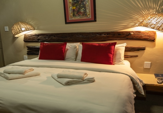 Jabulani Luxury Suite is furnished with a large double bed. The en-suite bathroom is equipped with a shower AND bath, hand basins and WC. The luxury suite has a private lounge with a fireplace, coffee making facilities, bar fridge and TVs in the lounge and the bedroom. Free WiFi Internet.