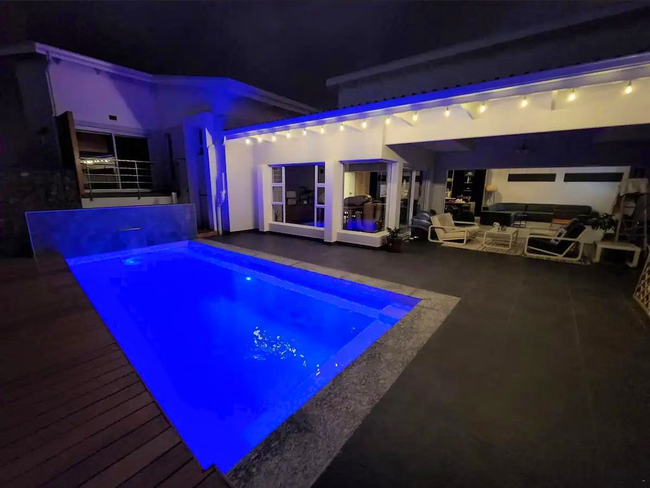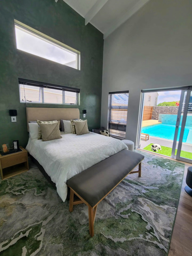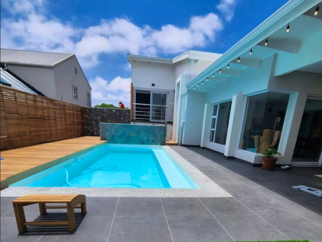 Langebaan Birds Nest Holiday Home is nestled in the prestigious Myburgh Park neighborhood of Langebaan. This charming retreat offers three elegantly appointed bedrooms, each with a queen-size bed and en-suite bathroom. Guests can enjoy a fully equipped kitchen, a spacious dining room, and a tastefully furnished living area. A private patio, complete with outdoor furniture, braai facilities, and a wood-fired hot tub, enhances the outdoor experience. Accommodating up to six guests, each bedroom features a queen-size bed, Smart TV, and an en-suite bathroom with a shower, washbasin, and toilet. Quality linen and bath towels are provided; however, guests are encouraged to bring their own beach towels. The open-plan living space includes a fully equipped kitchen with a stove, oven, microwave, and fridge-freezer, along with ample cutlery and crockery. A scullery offers additional conveniences such as a washing machine, tumble dryer, and dishwasher. Adjacent to the kitchen, a cozy lounge area with comfortable seating and a wall-mounted TV adjoins a spacious dining area with a seven-seater table. A separate entertainment area, featuring a Hydrofire combustion fireplace, provides a relaxing view of the inviting swimming pool. Outdoors, guests can unwind in the private wood-fired hot tub and enjoy al fresco dining at the braai area, blending comfort with outdoor enjoyment. The property also boasts a large heated swimming pool and is pet-friendly by arrangement. Ample parking is available for up to six vehicles, including space in the double garage, in front of the property, and along the gated side area.
