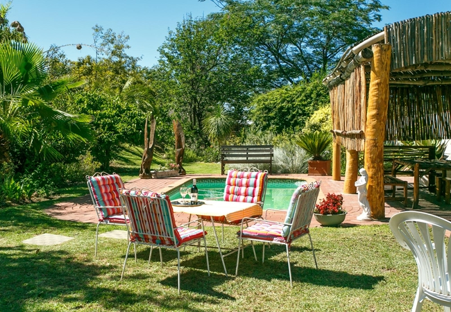 The beautiful garden with swimming pool and sociable braai area add to the unique atmosphere. Secure parking gives you peace of mind when you go to bed at night after an enjoyable day in our Ostrich Haven. You van take a walk in our large grounds where you will find a Herbgarden with more than 130 different species.