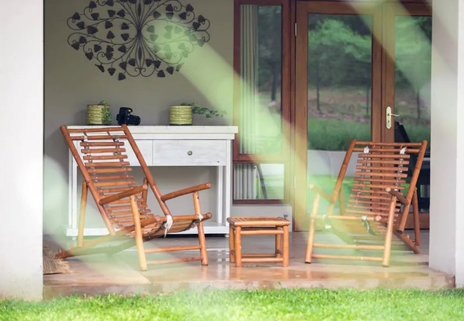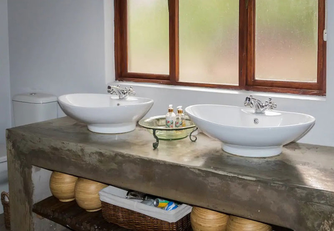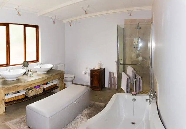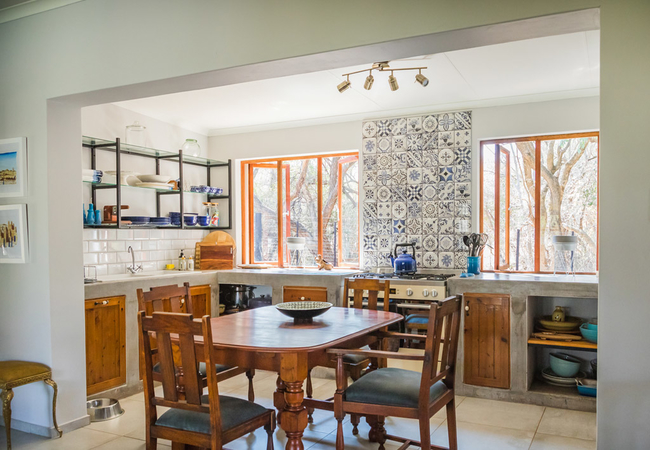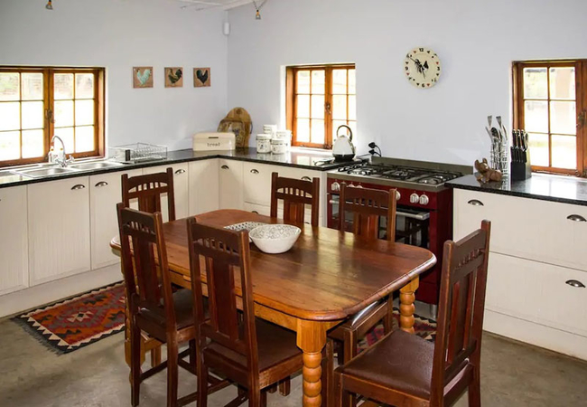 The Mountain House sleeps six guests in three bedrooms and two full bathrooms. The first bedroom has a Queen-size bed and the second has a double bed. The third bedroom is furnished with two single beds. All bed linen and bath towels are provided. The kitchen is fully equipped for self catering and includes all crockery, utensils, and a five-plate gas stove with gas oven, kettle and fridge / freezer. The living area is furnished with a fireplace. Outside there are two covered verandas as well as a private sheltered lapa. The Mountain House is green, only solar powered lights and gas fridge.