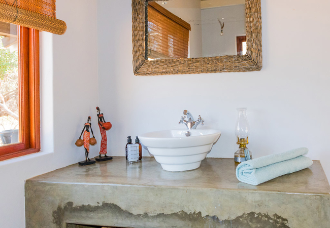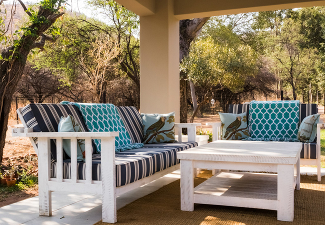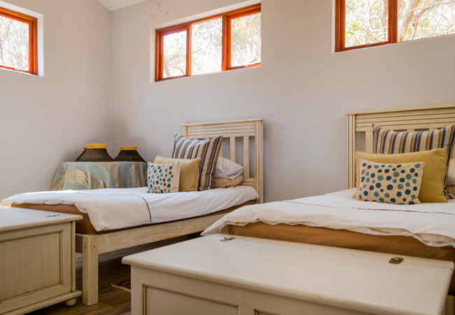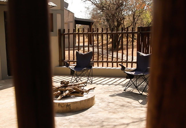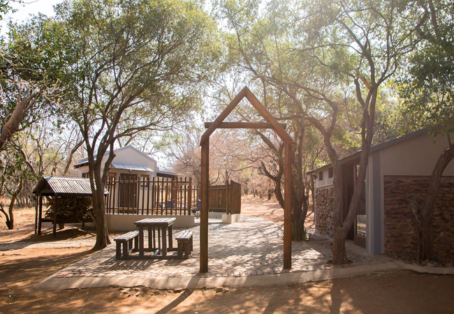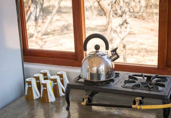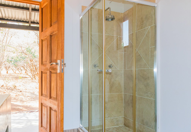 The camp has a large sleeping area with two single beds with an open plan sitting area. There are two bathrooms that have a shower, toilet and a basin. The kitchen is fully equipped for self catering and includes all crockery, utensils and a gas fridge / freezer. There is a private sheltered lapa braai area attached to kitchen as well as a shaded stoep and outside dining area. The camp is serviced daily.