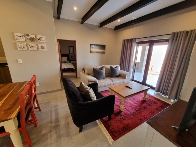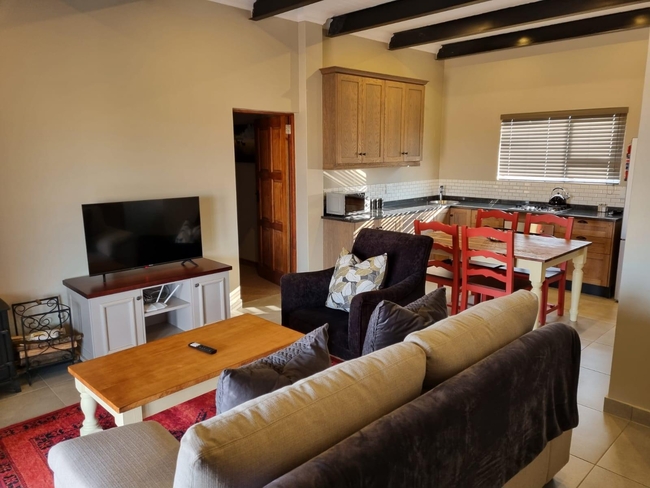 The cottage has an open plan living room with a TV with Netflix, a dining area and a fully equipped kitchen. Outside there is a patio with braai facilities and stunning stone boma.