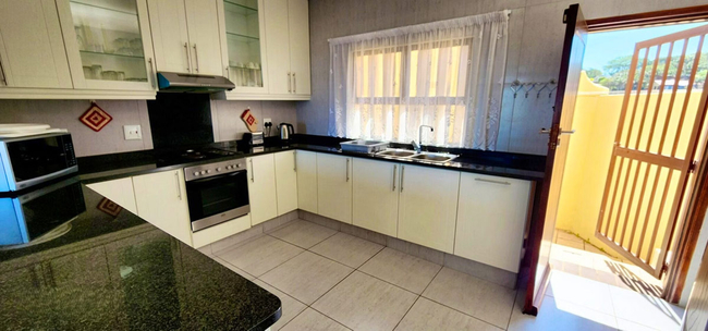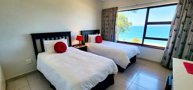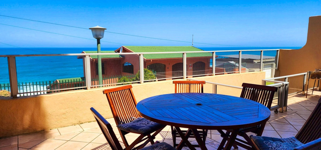 This self-catering duplex is ideal for families or groups of friends seeking a convenient and comfortable base from which to explore the surrounding area. The first bedroom features a queen-size bed and an en-suite bathroom with a bath, shower, washbasin, and toilet. The second and third bedrooms are each furnished with two single beds and share two bathrooms. One shared bathroom includes a shower, washbasin, and toilet, while the other offers a bath. Linen is supplied, although guests should bring their own bath and swimming towels. The kitchen is fully equipped with a fridge-freezer, stove, oven, microwave, washing machine, tumble dryer, and all necessary cutlery and crockery. Tea- and coffee-making facilities are provided, along with a breakfast bar with stools for casual dining. The living area includes a dining table, comfortable seating, and a TV with DStv, creating a welcoming space for relaxation and entertainment. Guests can enjoy a spacious balcony with outdoor seating, a braai, and sweeping ocean views. Additional features include an enclosed courtyard, two garages, and access to a communal swimming pool. The property is conveniently close to shops, restaurants, and other local amenities, while Lawrence Rock Beach is just 500 metres away.