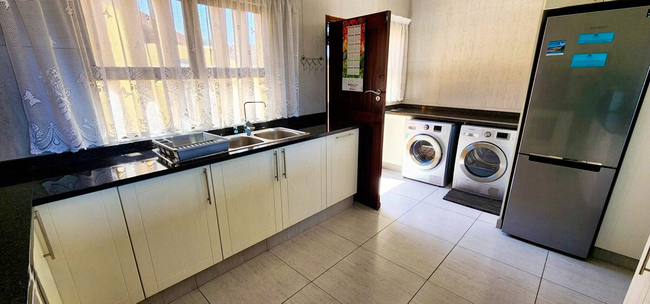The kitchen is fully equipped with a fridge-freezer, stove, oven, microwave, washing machine, tumble dryer, and all necessary cutlery and crockery. Tea- and coffee-making facilities are provided, along with a breakfast bar with stools for casual dining. The living area includes a dining table, comfortable seating, and a TV with DStv, creating a welcoming space for relaxation and entertainment.