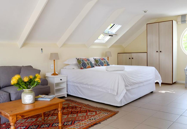 The upstairs Loft Suite sleeps two guests in a King-size bed. The bathroom has a shower. There is a open plan living with Wi-Fi, a TV and DStv, a kitchen with a counter and bar stools and a private balcony with seating.